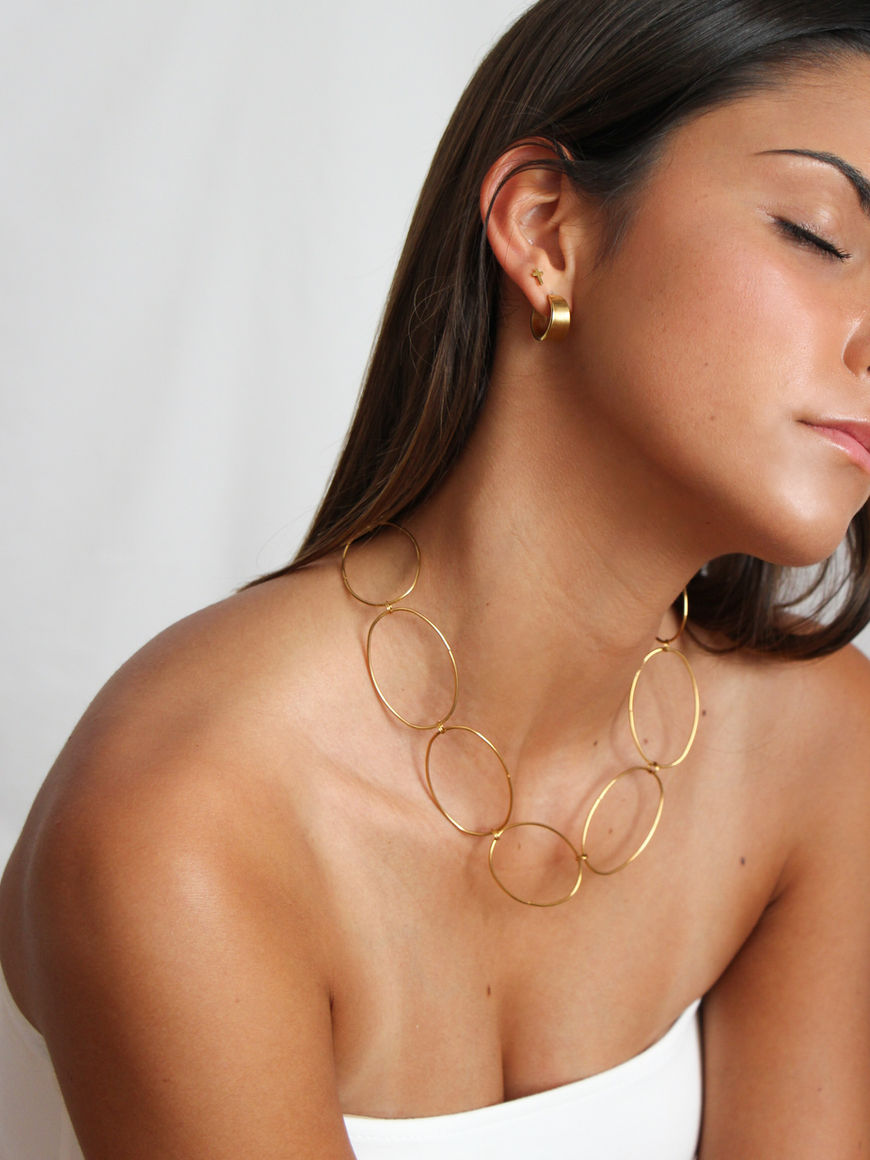 Make a bold statement with our oval linked necklace. This stunning piece features a series of large, interlocking golden ovals that create a fluid, eye-catching design.